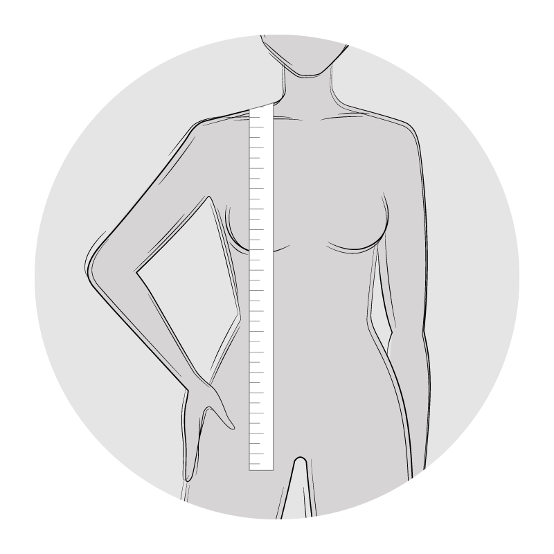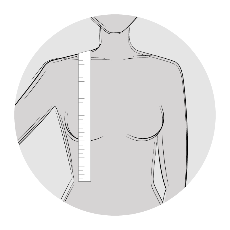 Coloca el extremo del metro en tu hombro y mide hasta un poco más abajo del comienzo de tu muslo. Es importante que el metro pase por encima de tu pecho, como muestra la imagen.