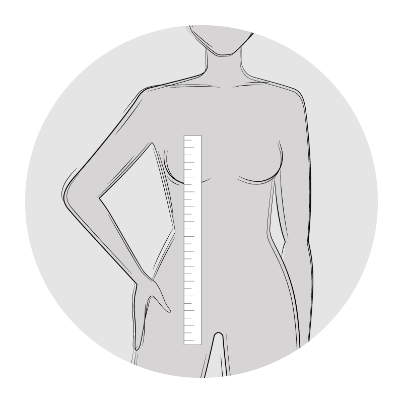 Coloca el extremo del metro donde empieza tu pecho y mide hasta un poco más abajo del comienzo de tu muslo. Es importante que el metro pase por encima de tu pecho, como muestra la imagen.